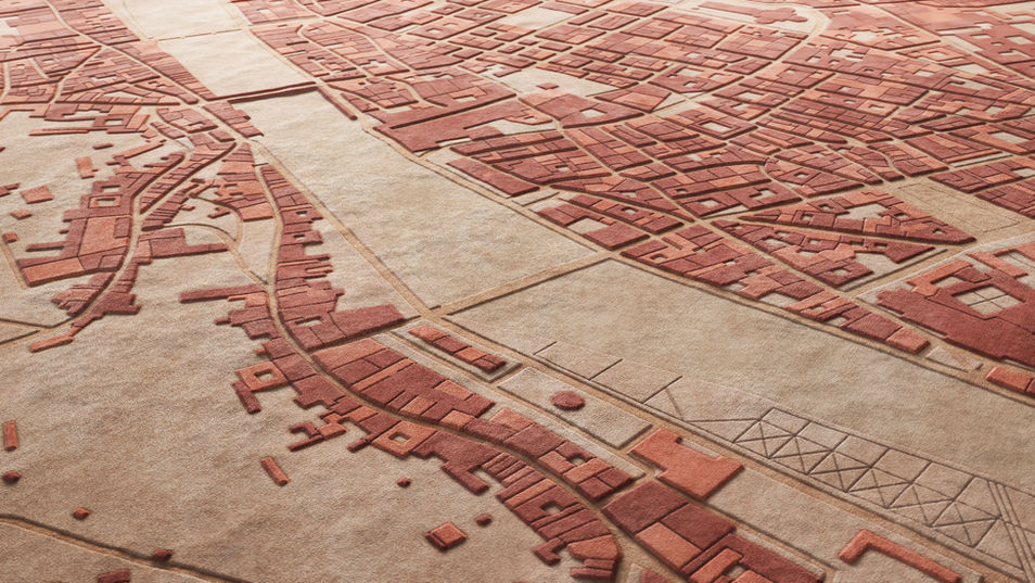 The Signature rug is tufted at multiple cut pile heights with 100% New Zealand wool, then hand-carved to give the urban pattern a plush, 3D relief texture.